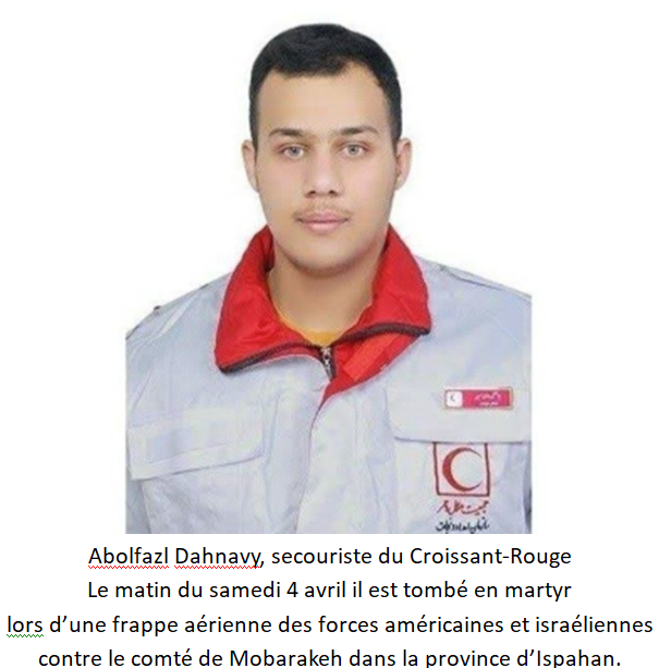 - Un véhicule de secours du Croissant‑Rouge de l’arrondissement de Sepidan, dans la province de Fars, a été complètement détruit lors d’une frappe aérienne américano‑sioniste. L’incident s’est produit aux environs de 5 heures du matin, dimanche, alors que les équipes du Croissant‑Rouge de Sepidan se rendaient dans la région de Komehr pour une opération de sauvetage. Les secouristes, qui avaient quitté le véhicule en voyant l’avion de combat, n’ont pas été blessés, mais le véhicule a été détruit dans son intégralité.